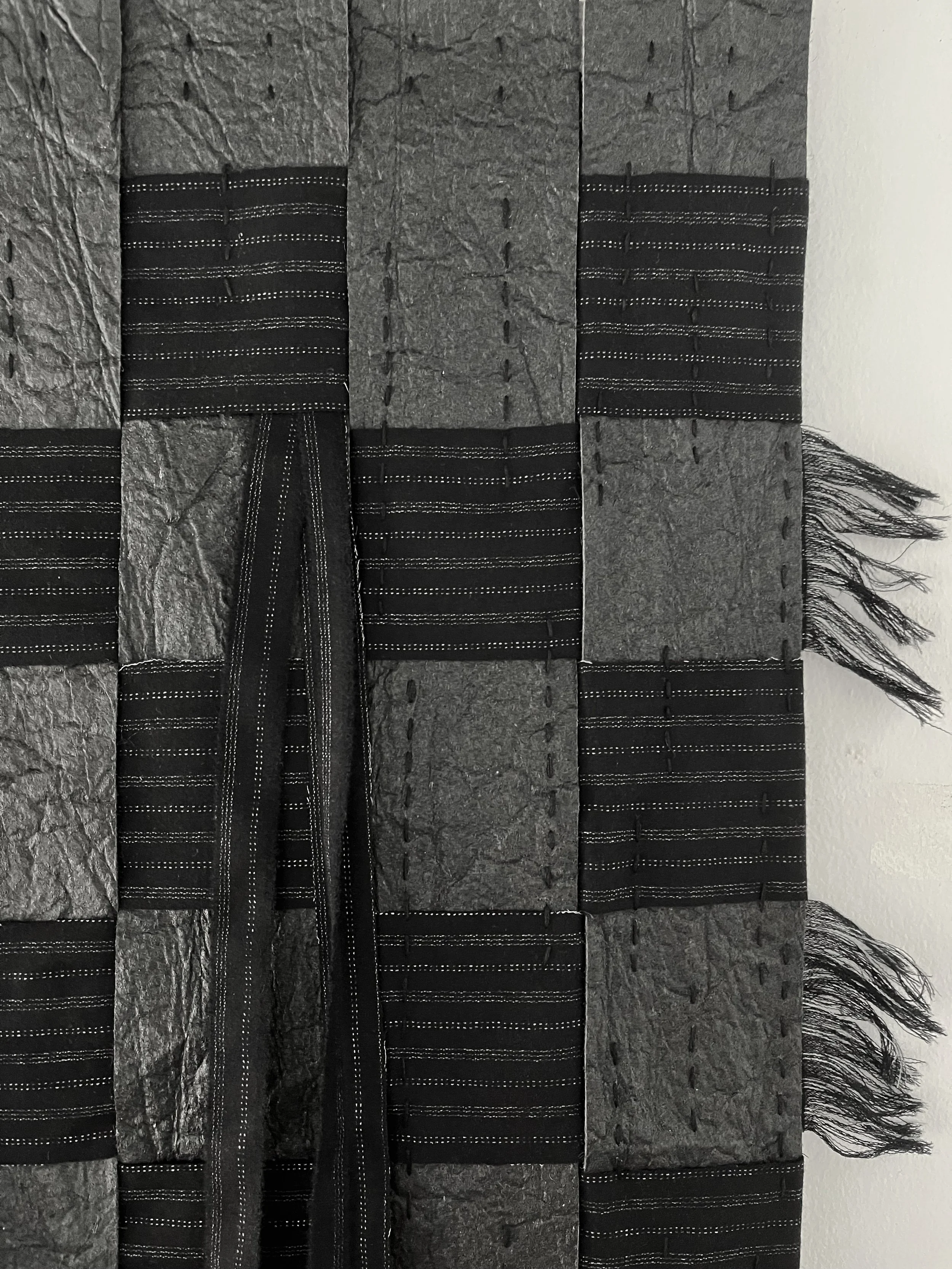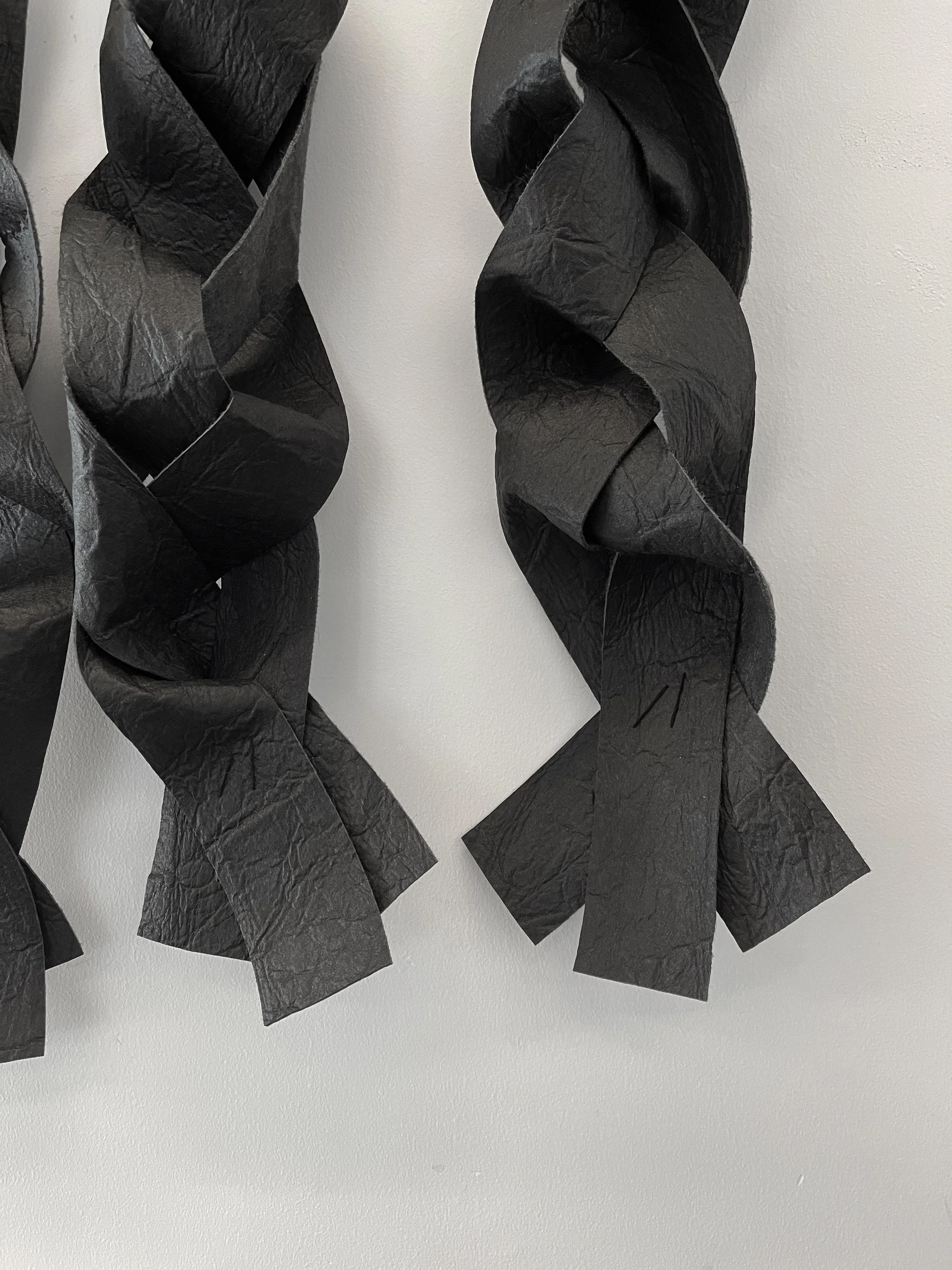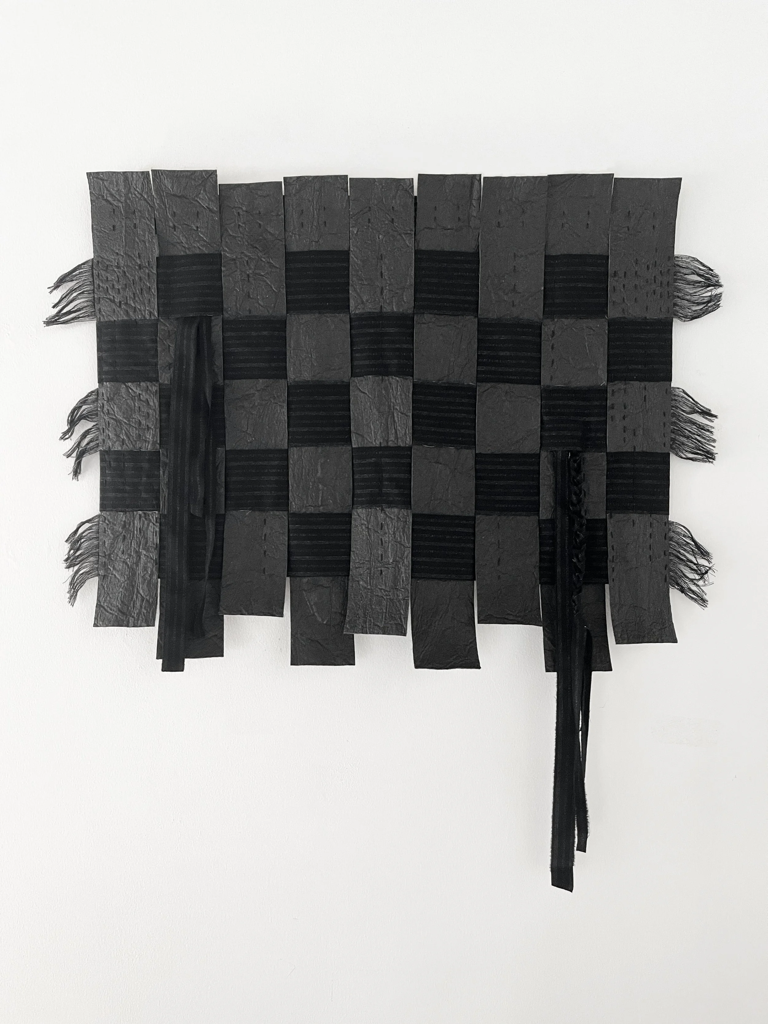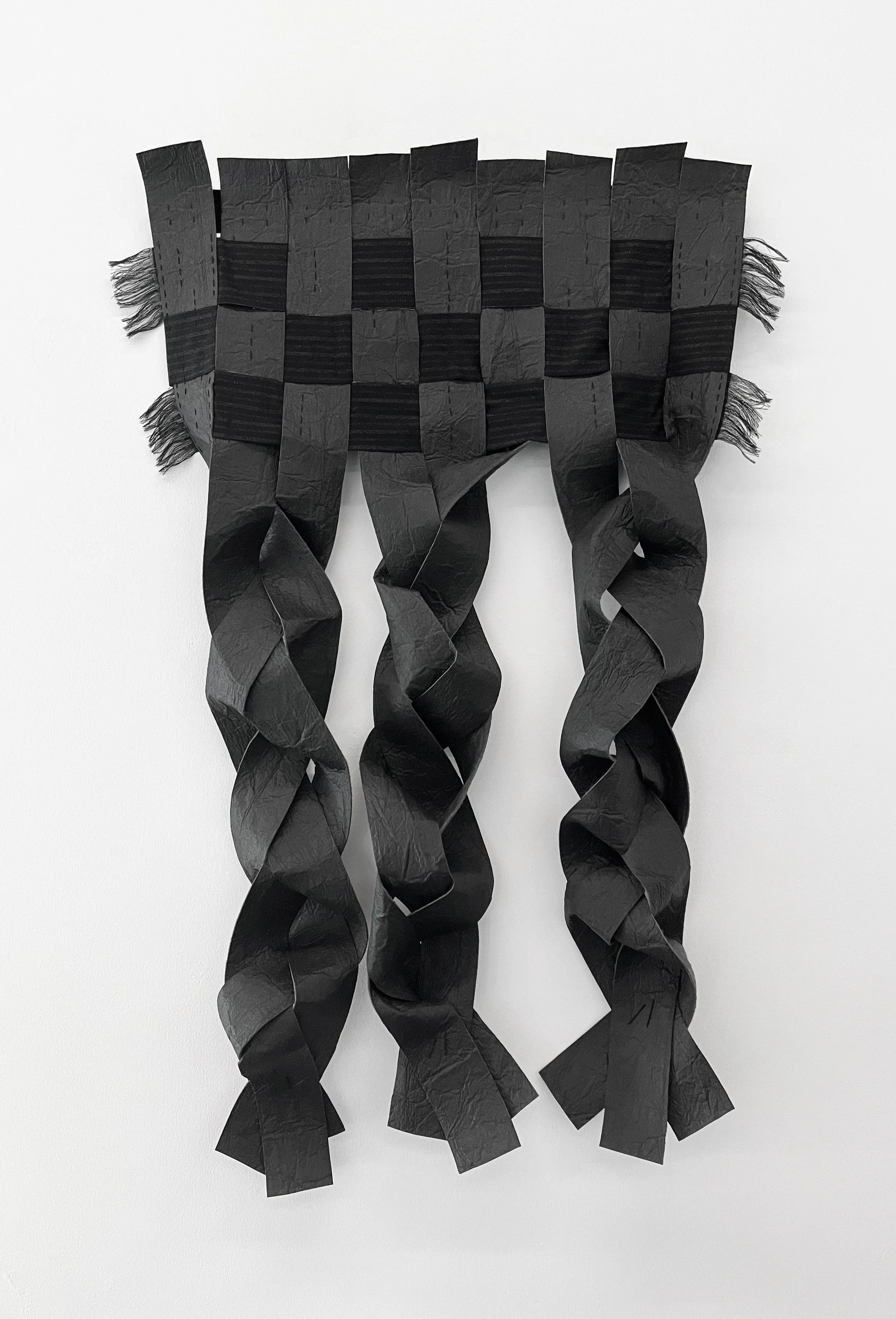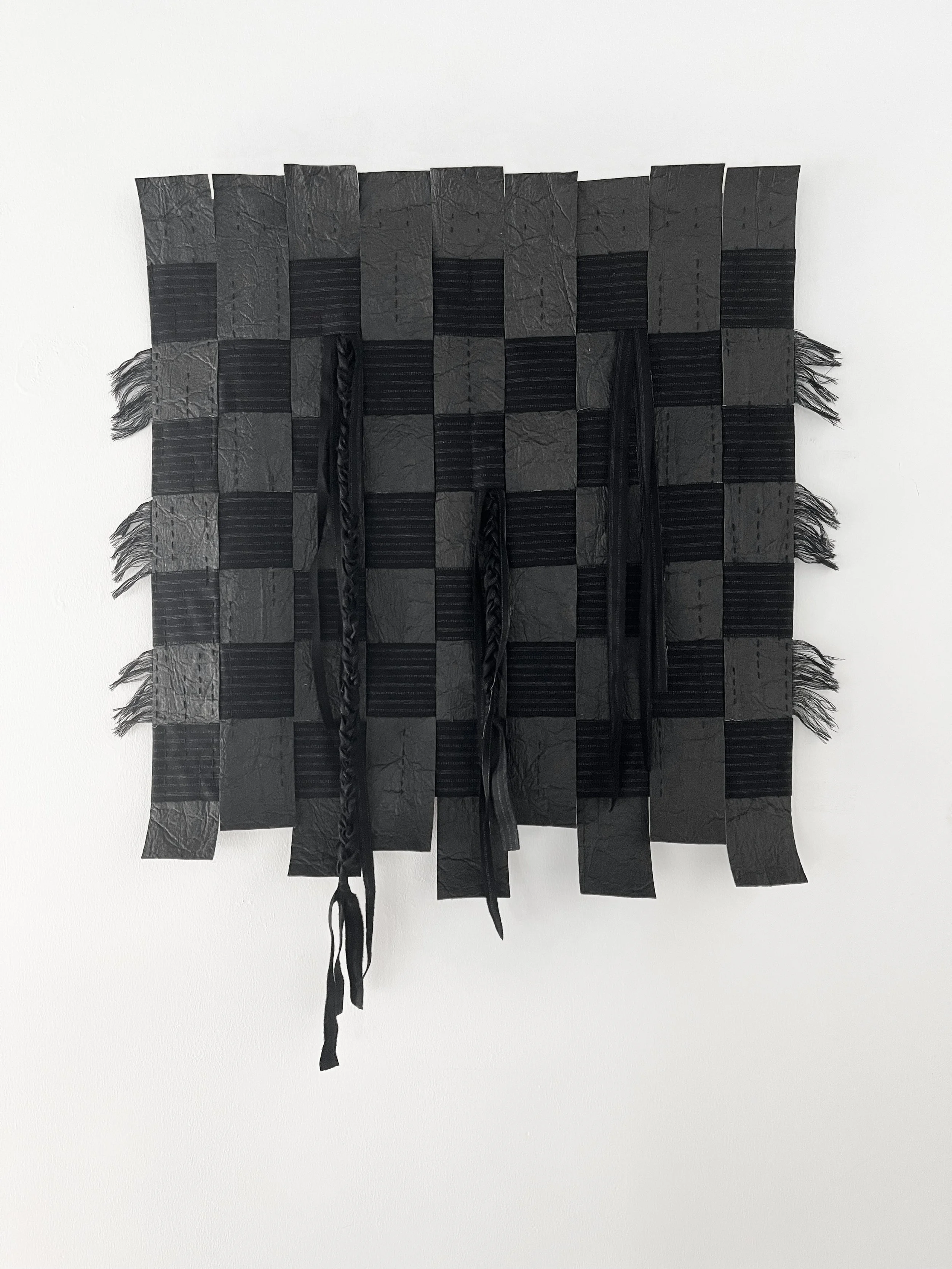 Rooted in the belief that black protects children from the malevolent gaze of the evil eye, the work draws from traditions in which dark cloth, garments, or kohl markings serve as shields creating confusion and protection. In this series, the interplay of soft and coarse textiles woven, braided, and layered evokes both the tenderness and restlessness of childhood.