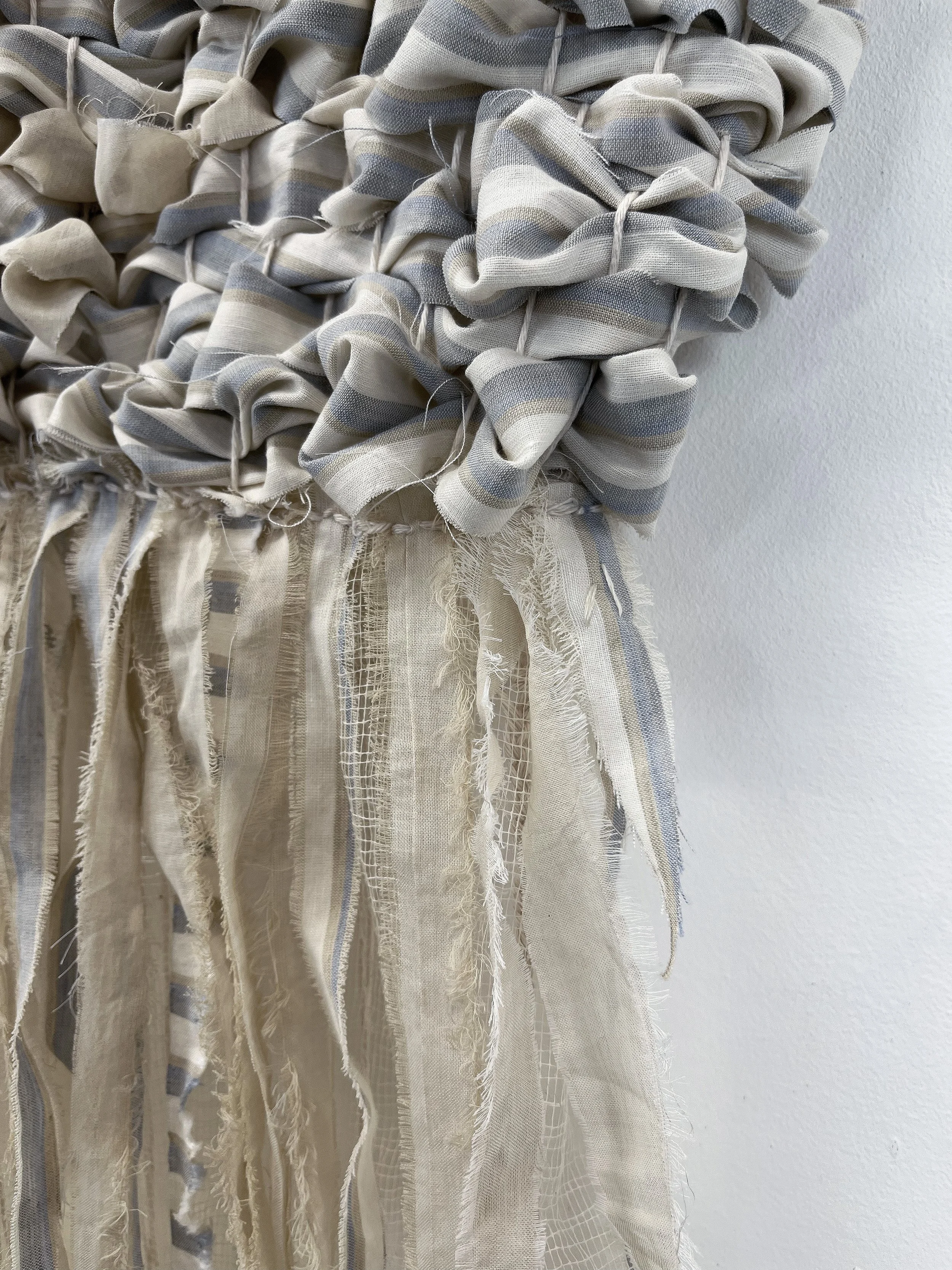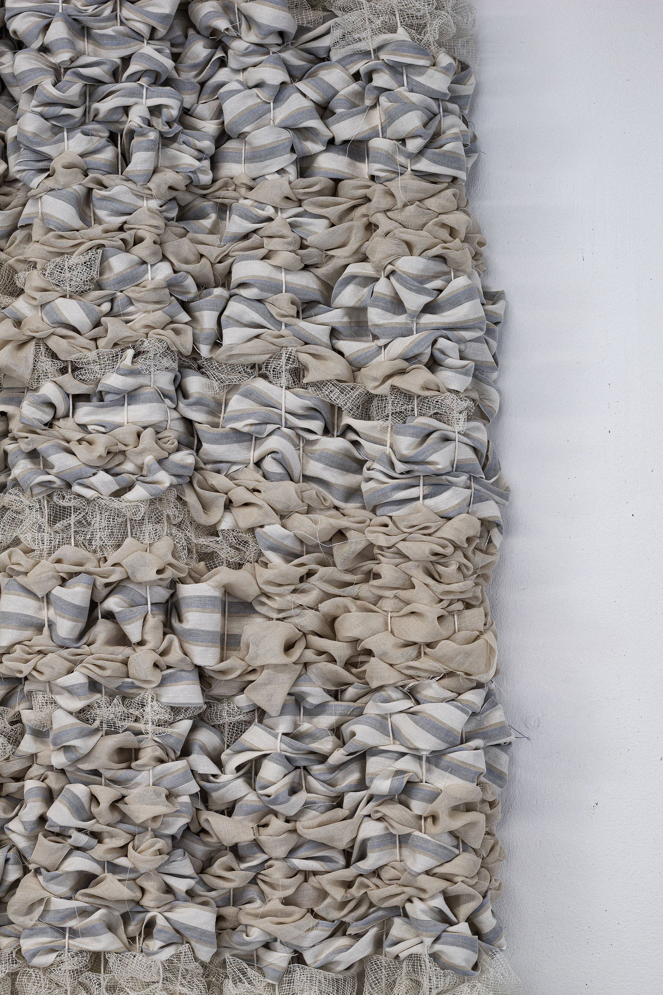 White agate stones are believed to protect a young mother during her pregnancy, but are specifically thought to enhance milk production for her newborn. Women were inclined to wear the stones during those months. This piece is a textile reconstruction of a white agate stone that mimics the lines and effects of the different tones and shades of white. The artwork is intended to exude a soft, natural and organic feel, an interpretation of motherhood.
