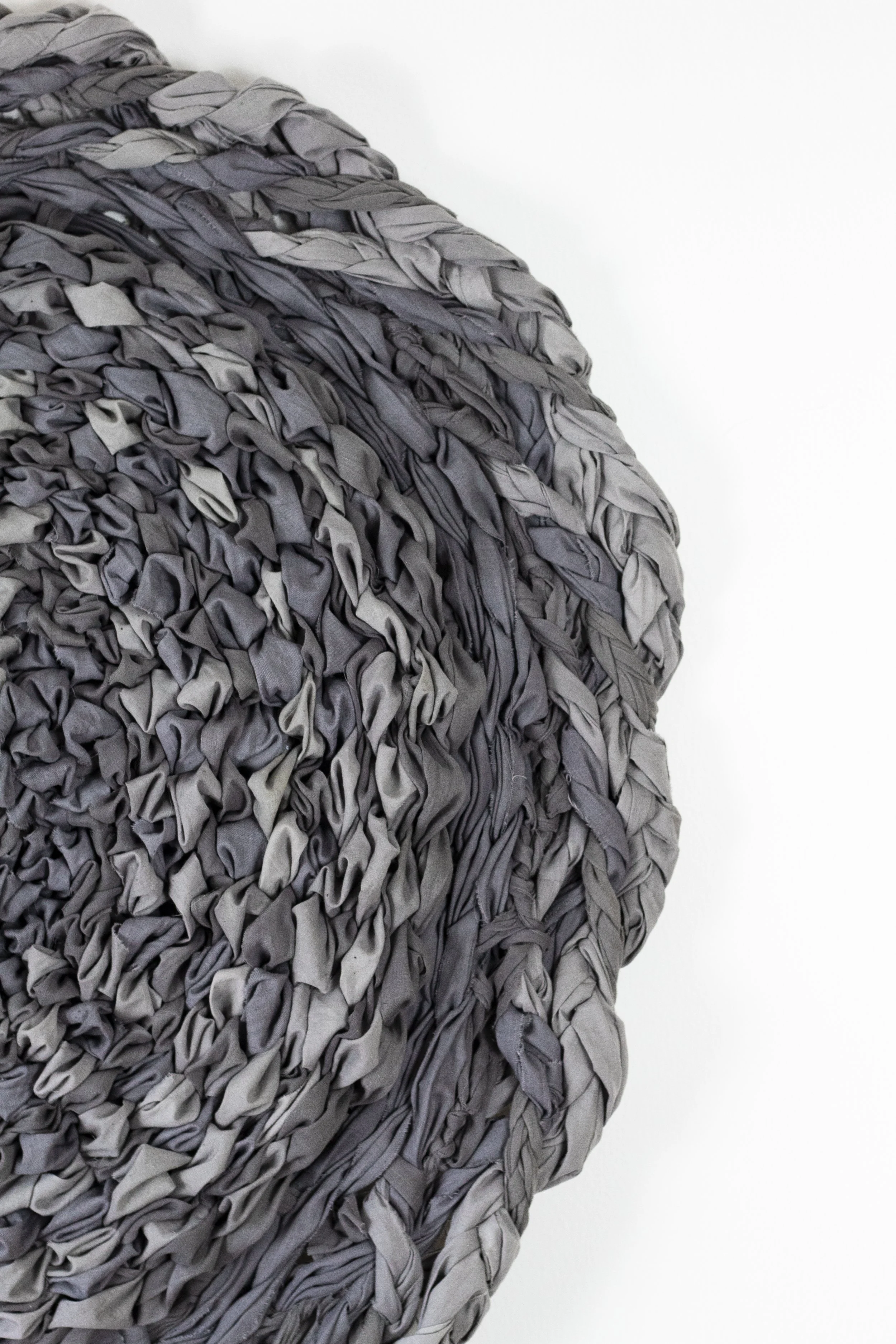 Her Rays (next artwork) and Sukun represent the sun and the moon. Powerful symbols throughout history, the sun and zodiac feature prominently in the mosaic frieze which Walter Crane designed for the Arab Hall. Here, Hage has captured the sun and moon through colour and texture. In Her Rays golden brown silk and cotton braids hang down representing the sun’s rays. In contrast in Sukun, the moon’s cool serenity and calm is reflected in pale grey and purple tones. This piece was woven on a circular loom in a technique crafted by the artist and is surrounded by braids. In West Asian culture braids are believed to lock in the evil eye and bad energy.